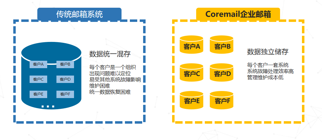 Coremail自建邮件系统的邮件数据独立存储在企业内部的邮件服务器上,企业自主维护与独立保存,实现了邮件信息的安全可控。同时Coremail提供的邮件备份与反垃圾反病毒等多样安全功能,能够有效保证企业的邮件数据安全。