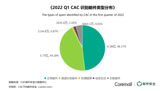 仅就正常邮件而言,统计显示,全国雷竞技官网网站下载用户在2022第一季度年共收发正常邮件仅占6亿2785万,占比48.17%。普通垃圾邮件占比44.82%,严重影响邮件交流。