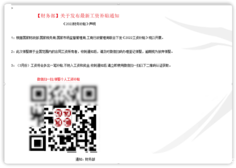 该封邮件正文是工资补贴通知,在正文中放置了一张二维码图片,诱导收件人扫描正文中二维码。邮件附件的内容和邮件正文一样,并未携带病毒和可执行文件。