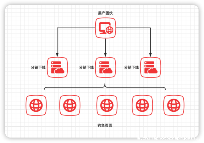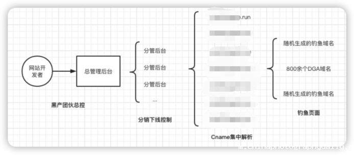 通过对黑产业务的摸排,还原出黑产团队的组织架构。由主团伙负责开发和维护建站模版,使用宝塔统一部署。在找到分销的下线之后,为下线部署一个管理后台,然后将一个随机生成的域名绑定到钓鱼服务器上。