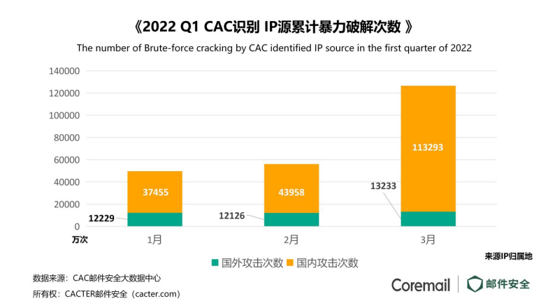 根据CAC邮件安全大数据中心监测,2022年Q1季度,境外暴力破解IP主要来源于美国,俄罗斯以及印度。