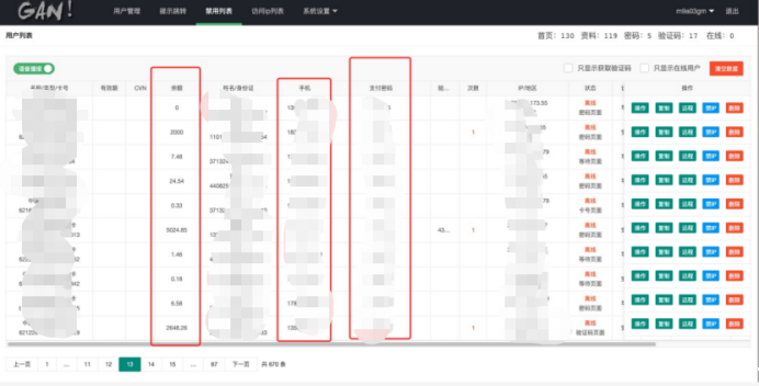 用户功能处显示所有受害者的姓名、银行卡号、身份证号、手机号、支付密码、IP地址\地区、在线状态、使用设备、操作记录和添加时间等信息。