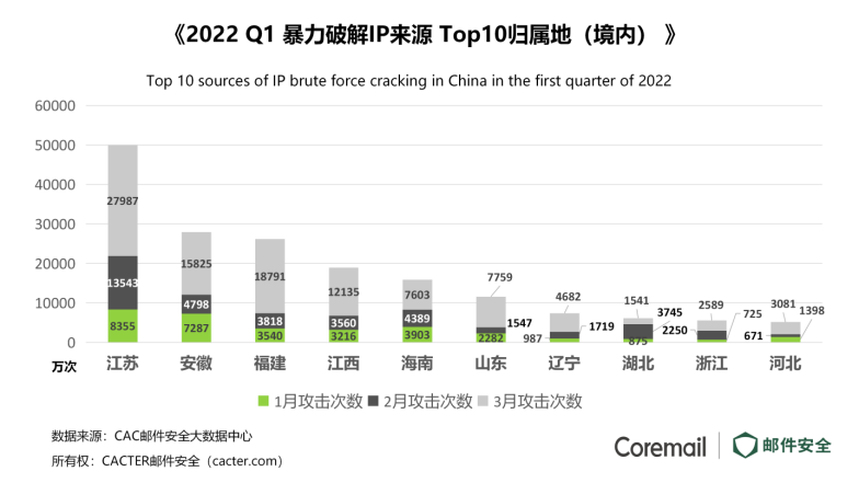 IP来自国内的暴力破解次数持续上涨,3月环比增幅高达157%,3月主要集中地区是江苏,安徽,福建和江西。