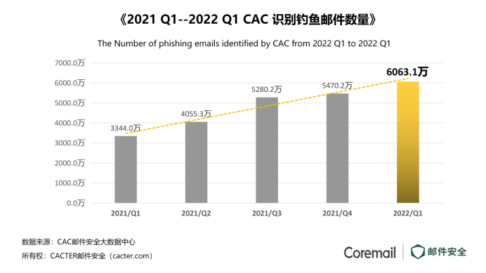 2022年Q1季度中钓鱼邮件的占比逐渐上升,一方面是因为钓鱼邮件数量的增多,另一方面CAC反垃圾算法的更新迭代也让CAC对钓鱼邮件的识别更加精确。