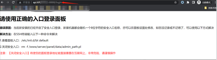 对此域名进行端口扫描,发现开启8888端口,访问该端口为发现宝塔登录面板,由此可得出此钓鱼为宝塔统一部署,从正面渗透进入宝塔难度极高。