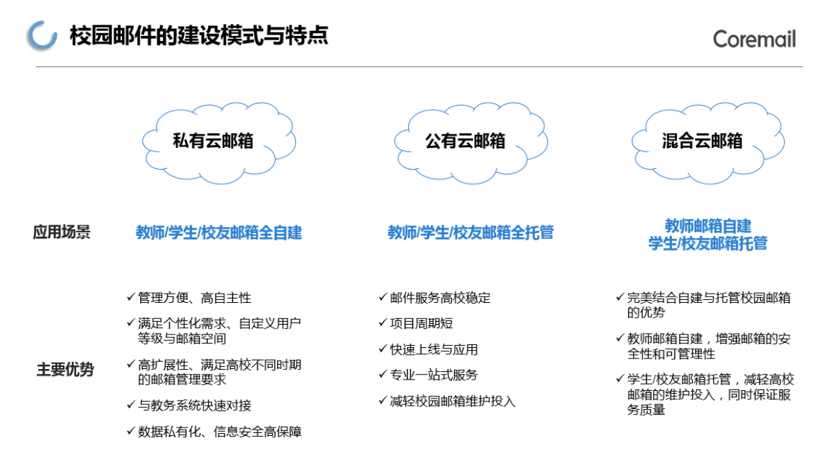 Coremail校园邮专业版,是Coremail推出的完全自主研发的安全电子邮件系统。专为学生群体众多、流动量大的特点,推出首次登陆激活功能、qq微信扫码登录、校友迁移功能等。其在功能上满足高校对教师邮箱、学生邮箱以及校友邮箱的差异化需求;在部署架构上,不仅可提供传统的自建方案,还可提供公有云、专属云与混合云解决方案,助力高校客户打造数字化校园。