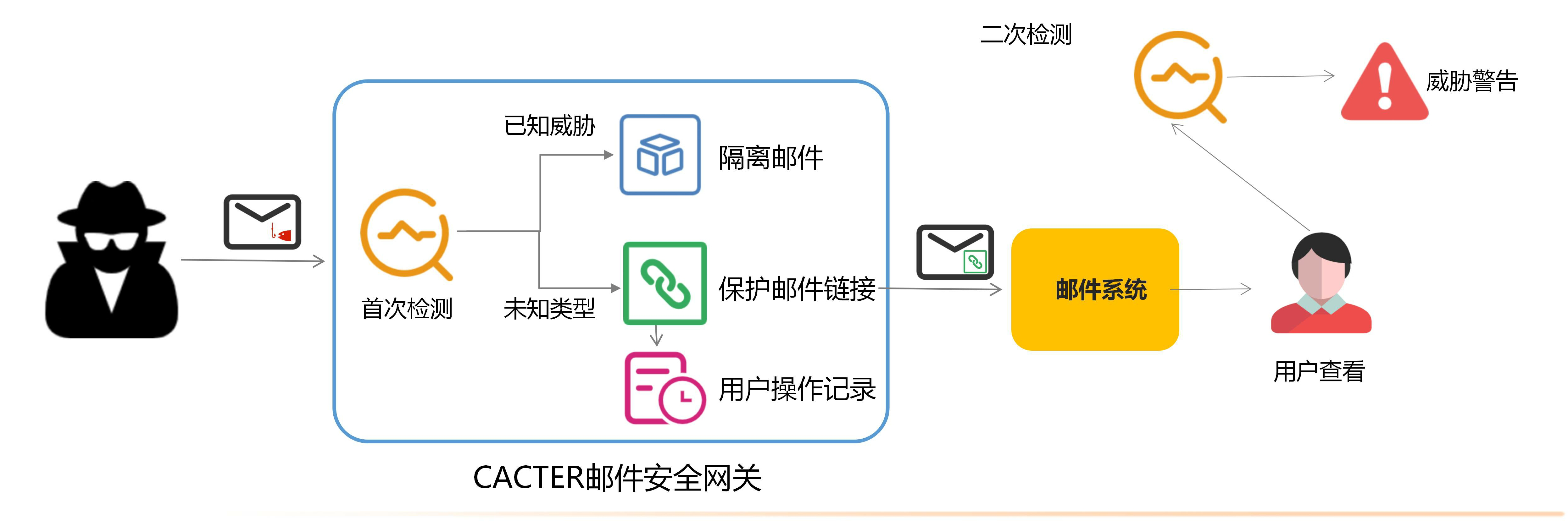 使用CACTER邮件网关后,管理员可开启恶意链接保护功能,对投往邮件系统的每一封邮件的链接进行保护。首次过滤+二次检测防护,事前拦截、事中提醒、事后追溯结合,为邮件系统的邮件安全保驾护航。