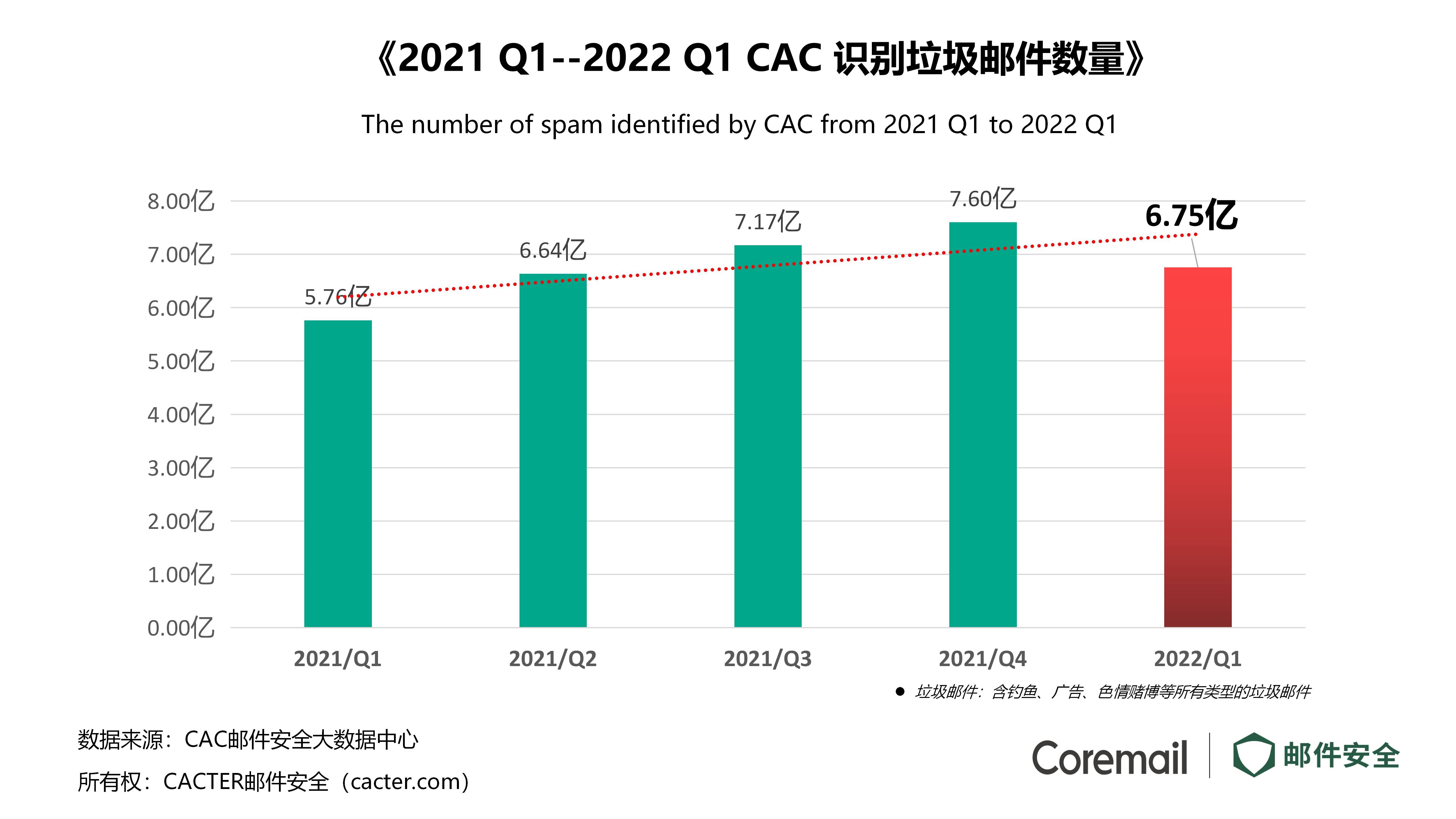 根据CAC大数据中心评估,2022 Q1季度全国雷竞技官网网站下载用户共收到各类垃圾邮件6.75亿封,同比增长17.28%。