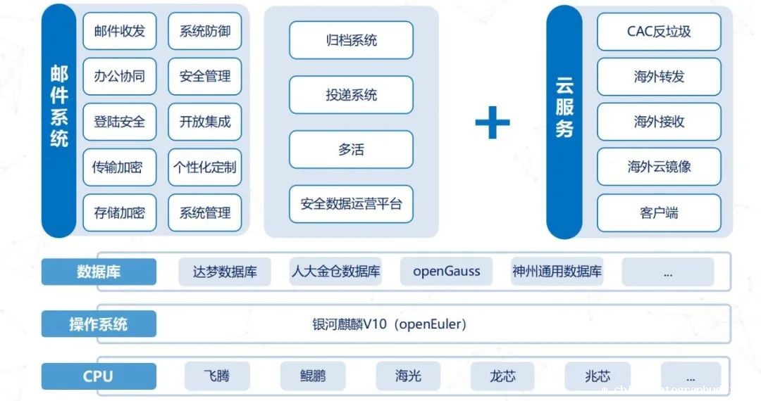 本次Coremail XT6在架构上融合麒麟操作系统,搭建国产化一体云平台。同时在适配开发过程中,对邮件系统模块、云服务方面都进行了优化。多角度全方位布局升级,共同打造安全稳定可靠的邮件服务平台。