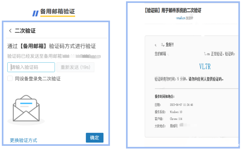 △登录验证时,选择“备用邮箱”作为验证方式。登录备用邮箱并获取验证码后,返回验证界面输入即完成验证。