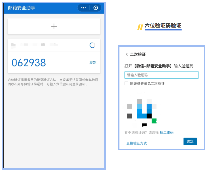 △扫描或直接打开微信小程序“邮箱安全助手”查找对应六位验证码后,在二次验证码栏里输入即可。