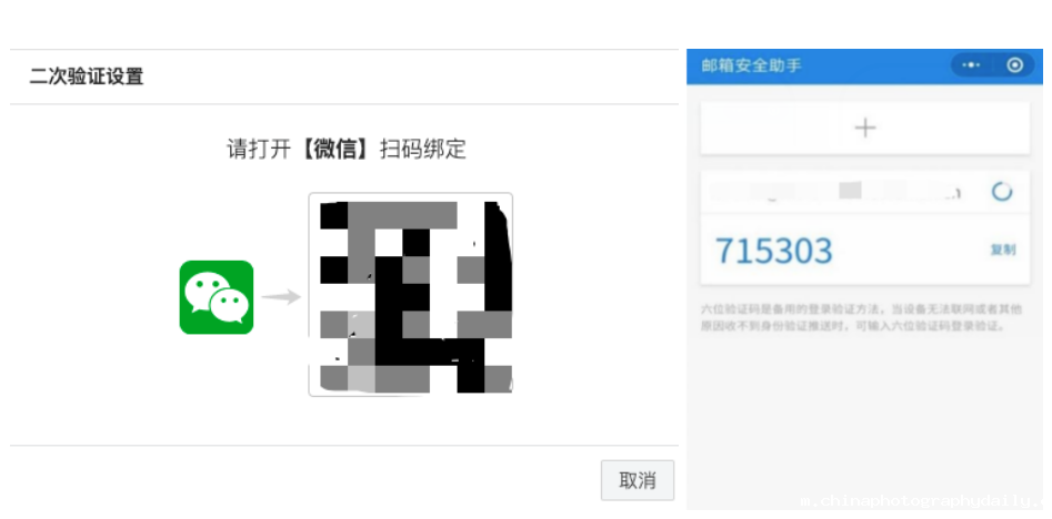 2)在webmail或Coremail 邮箱客户端软件 V4.0及以上版本的二次验证绑定页,用微信扫码完成绑定。