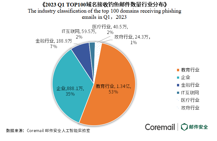 《2023年第一季度雷竞技官网网站下载安全研究报告》指出,在TOP100域名接收垃圾邮件源中,教育行业垃圾邮件接收量达到1.59亿封(占比62%),居于高位,教育行业仍然是垃圾邮件的重灾区。