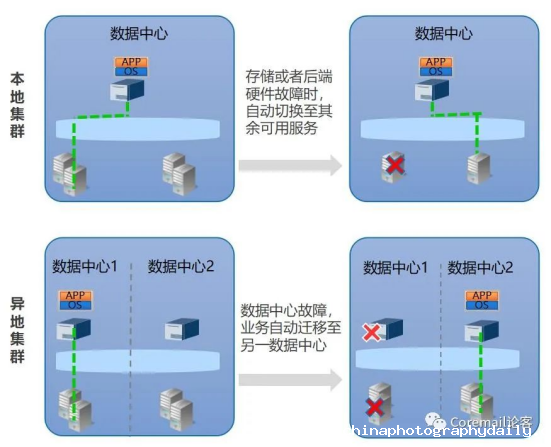 本地集群的情况下,当存储或者后端硬件故障时,自动切换至其余可用服务,达到业务不中断、客户无感知的“秒级切换”;如果是异地集群,当数据中心故障,业务则自动迁移至另一数据中心,达到业务快速恢复的“分钟级中断”。
